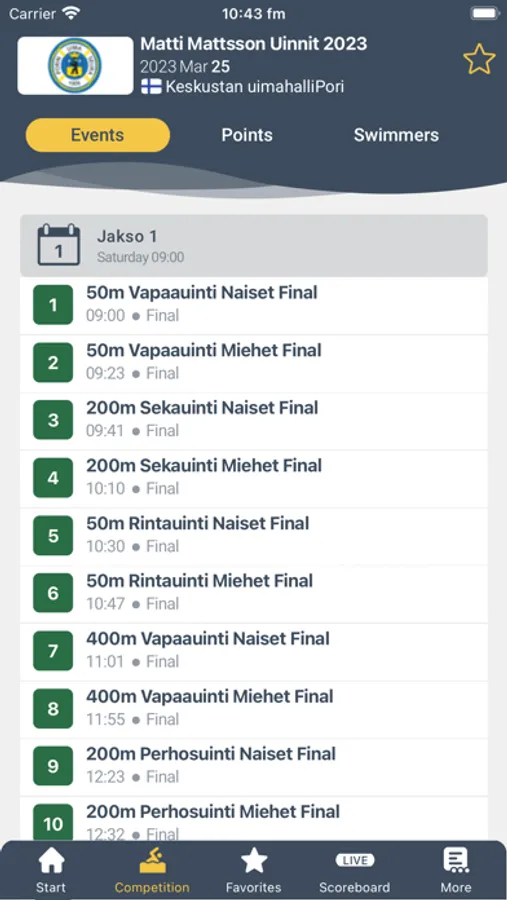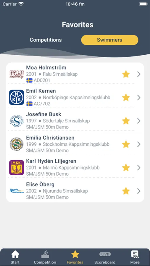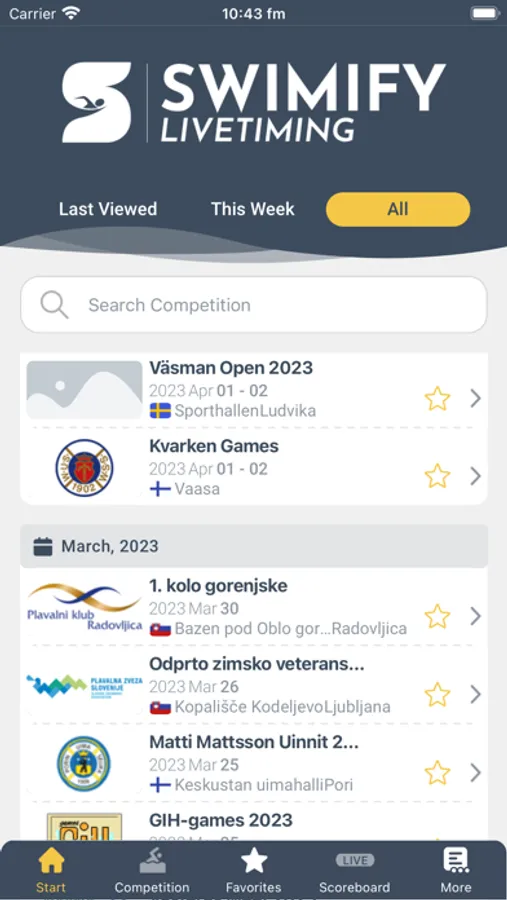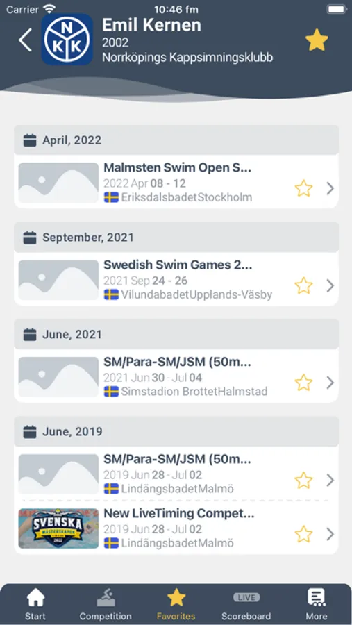 With Swimify LiveTiming Plus subscription you can star both competitions and swimmers for easy access. Follow your favorite swimmers and find all competitions they have participated in.