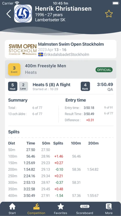 With a Livetiming Plus subscription (first two weeks for free!) you gain access to all swimming competition information in one place. Get easy access to both competition overview and race details with just a few clicks. See entries, points, clubs and rankings.