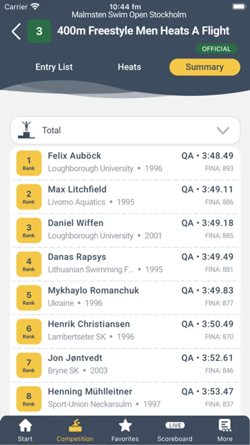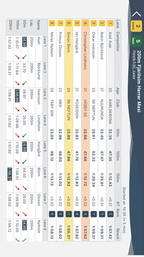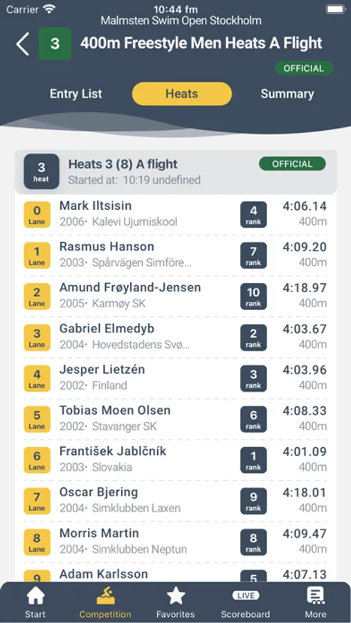 Follow the competition in real time. Get live updates on heats, splits, take over times in relays and rankings.