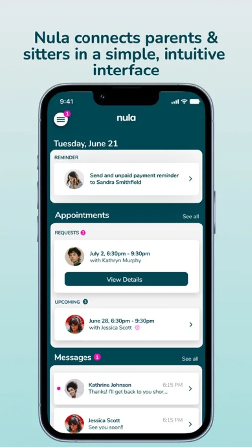 Nula helps parents cut through the anxieties of managing childcare, while helping sitters with greater efficiency and transparency. Nula incorporates key features such as appointments and tasks management, payment, in-app communications, and geolocation into one intuitive interface. For parents, the live location feature brings a sense of security, and for sitters the task management feature brings transparency and responsiveness. Nula has the power to bring confidence, trust, and peace of mind to countless households.