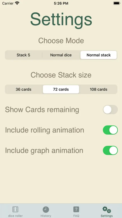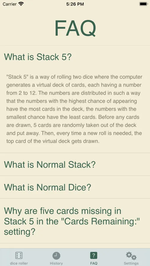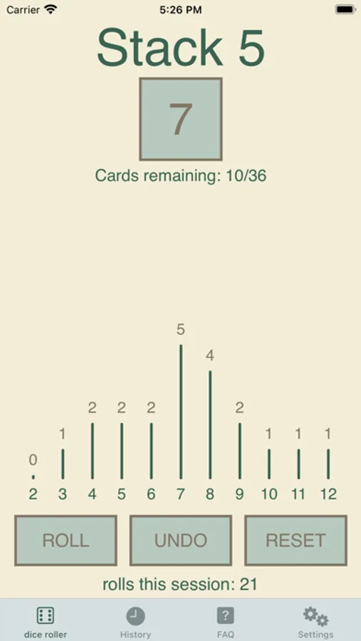 Here, instead of randomly rolling two dice each time, the app creates a virtual stack of cards before the rolls begin. On those virtual cards, the numbers from 2 to 12 (the numbers that can be rolled with two dice) are distributed in such a way that the numbers with the highest probability of being rolled (e.g. 6 and 8) have the most cards in the deck, and vice versa with the numbers with the lowest probability (e.g. 2 and 12). Before any cards are "drawn", 5 cards are removed from the deck.