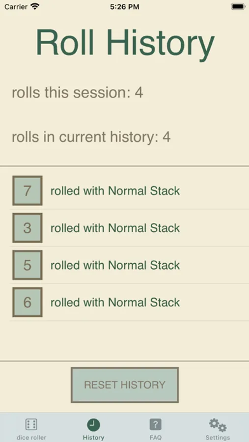 In the "History" section, you can review old rolls as well as other changes, such as changes in the settings or resets of the rolls. Keep in mind that you must have rolled at least one number for there to be any history.