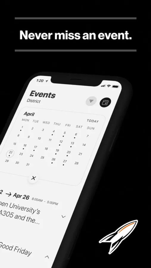 The event section shows a list of events throughout the district. Users can add an event to your calendar to share the event with friends and family with one tap.