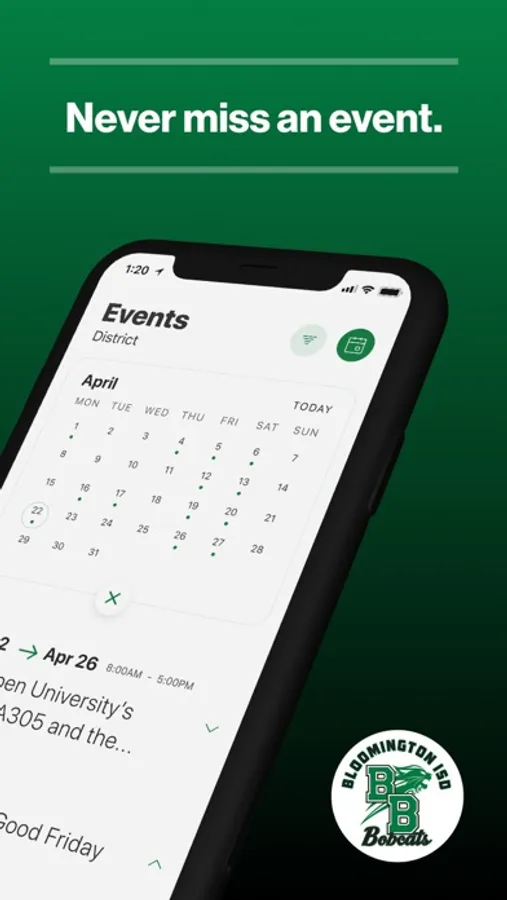The event section shows a list of events throughout the district. Users can add an event to your calendar to share the event with friends and family with one tap.