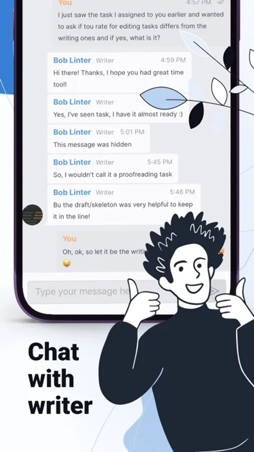 Say you have an important client waiting for your email, a boss who is waiting for a quarterly report, and a publisher who needs you to submit a new chapter of your book. It seems like a nightmare, right? Here is what you have to do: download our app, fill out the order form and share instructions for the tasks you wish to delegate to the copywriter. Check out the profiles of the copywriters, chat with them, and see who seems like a perfect fit for your task. Deposit funds to your Balance, but don't worry; the funds will stay on your Balance until you're fully satisfied with the results. Once the task is done, you'll be notified via email. Check the copywriter's work and request edits if any are needed, and once you're happy with the results - release the funds to your helper.