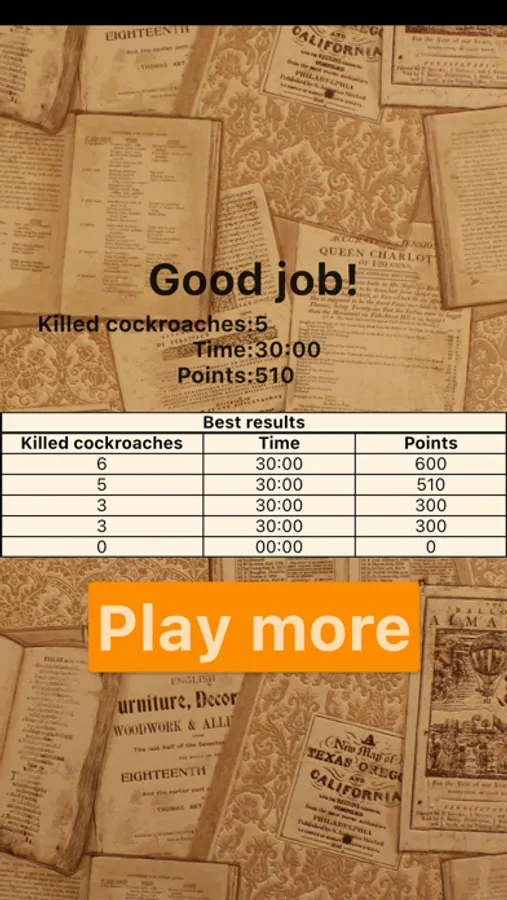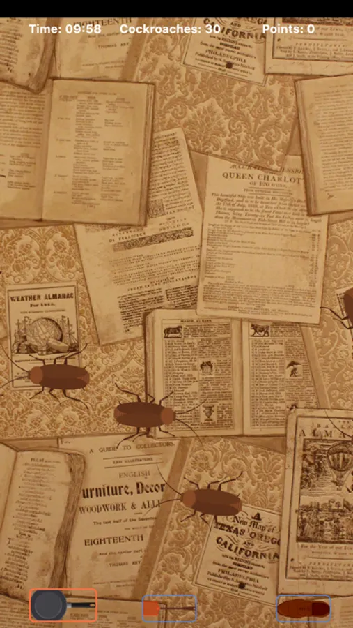 The game is divided into rounds of 30 seconds each. Try to crush as many cockroaches as possible in 30 seconds! In each round, there will be 30 cockroaches that crawl across the screen in an unpredictable manner. You will have one second for each cockroach.