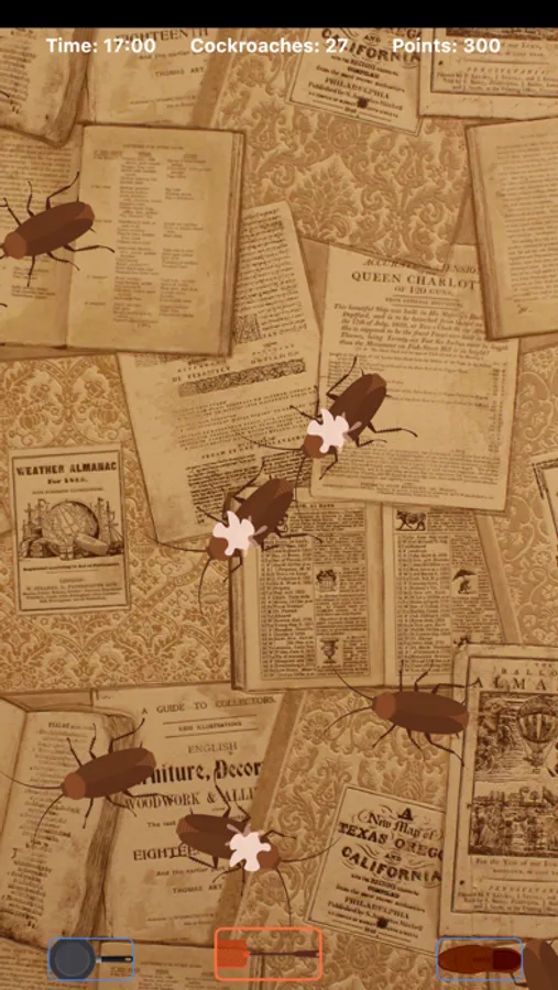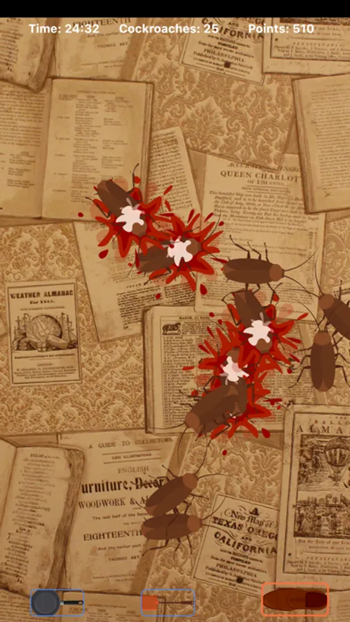 Each cockroach crawls with a different speed and acceleration, constantly driving directions like a real cockroach! Remember that every cunning cockroach always wants to hide in a safe place, outside the display. Crush the cockroaches before they have time to hide and destroy those that crawl out of their shelter! Each cockroach can stay in its shelter until the end of the round, because do not hesitate to kill cockroaches quickly!