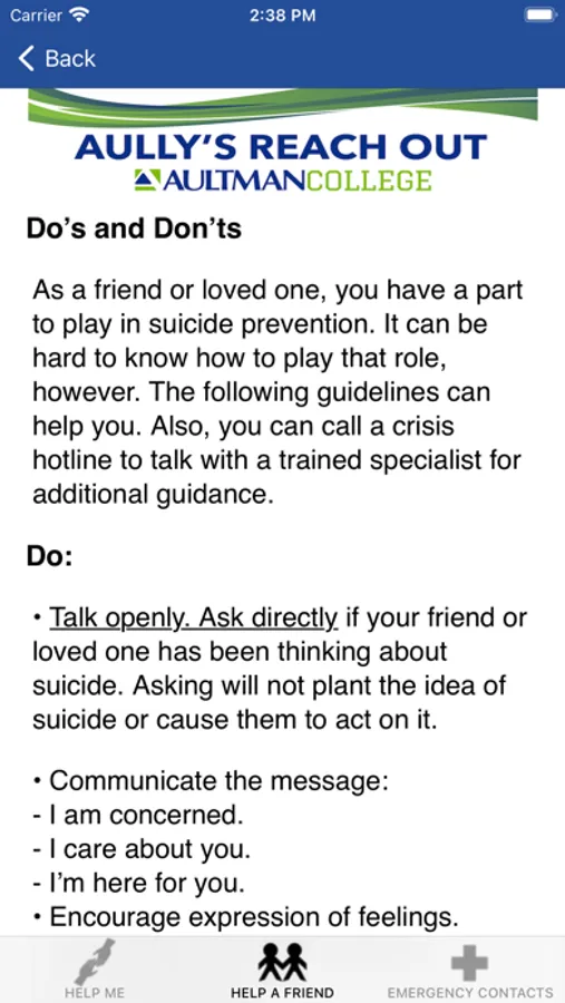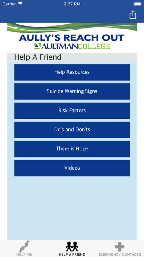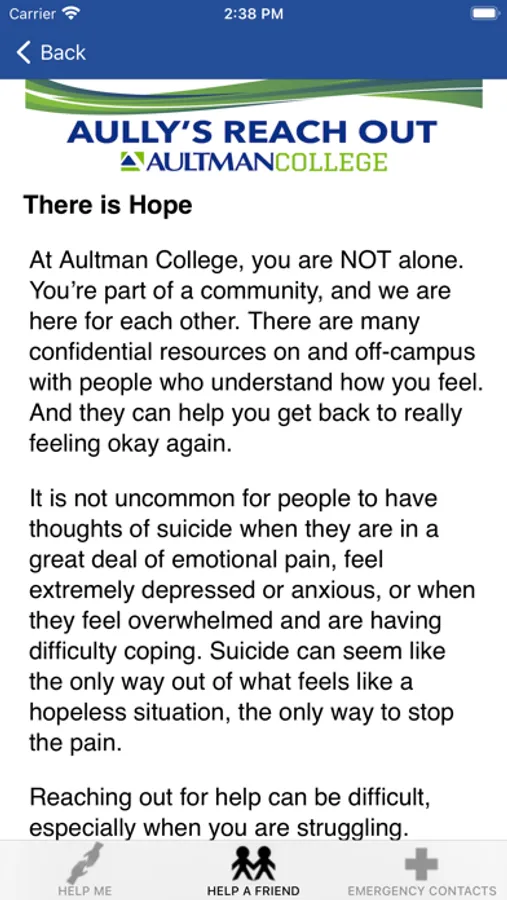 Aultman College’s Reach Out app provides guidance for supporting a friend in need, suicide prevention, or coping with mental health challenges. With the “My Support Network” function, users can create a customized collection of just those contacts they especially want to quickly access and reach out to by phone or text during difficult times. Reach Out also provides easy and centralized access to potentially life-saving resources and services offered on campus and in the community, including crisis hotlines. The Reach Out app is designed for students, parents, friends of students, faculty and staff of Aultman College, located in Canton, Ohio. The Reach Out app better prepares people to help a friend, loved one or themselves.