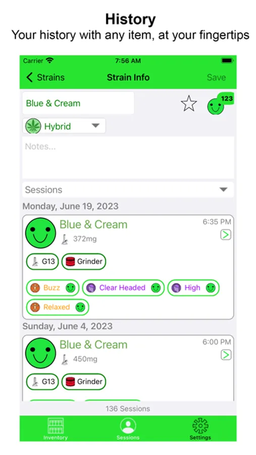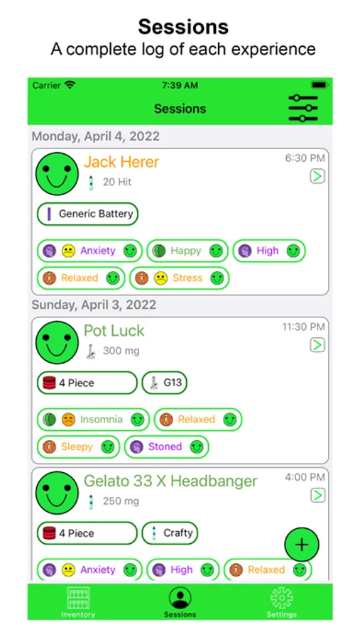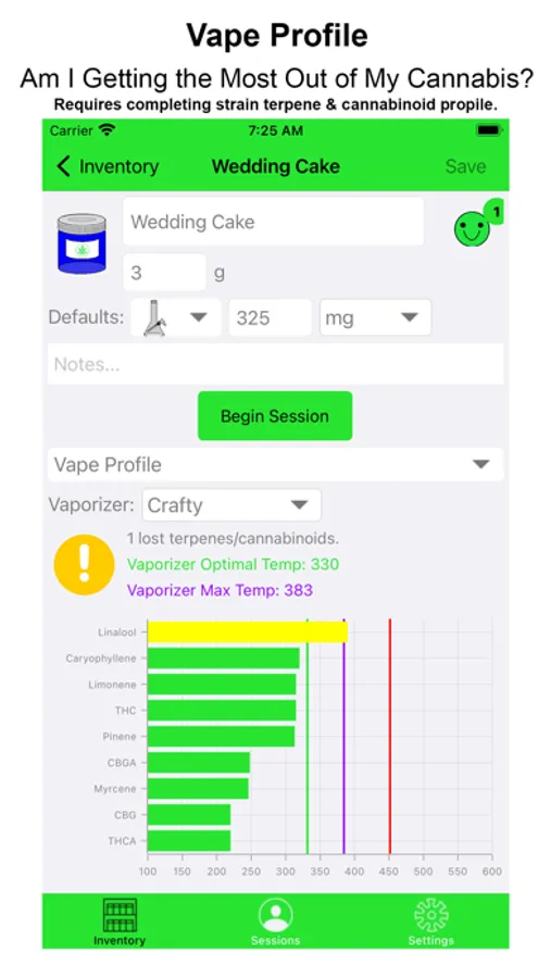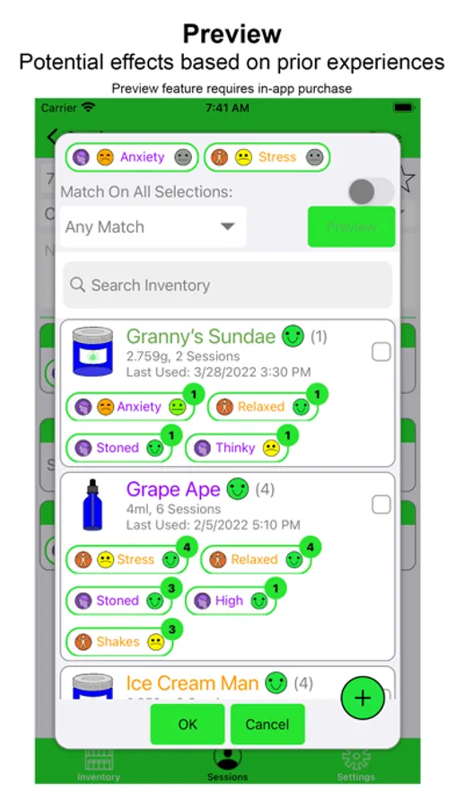 • Designed for medical patients, Preview is a powerful feature that displays the average effects from prior recorded sessions. This summary of which strain on hand has provided you the best relief in the past allows you to decide which is most likely to provide the relief and experience desired.