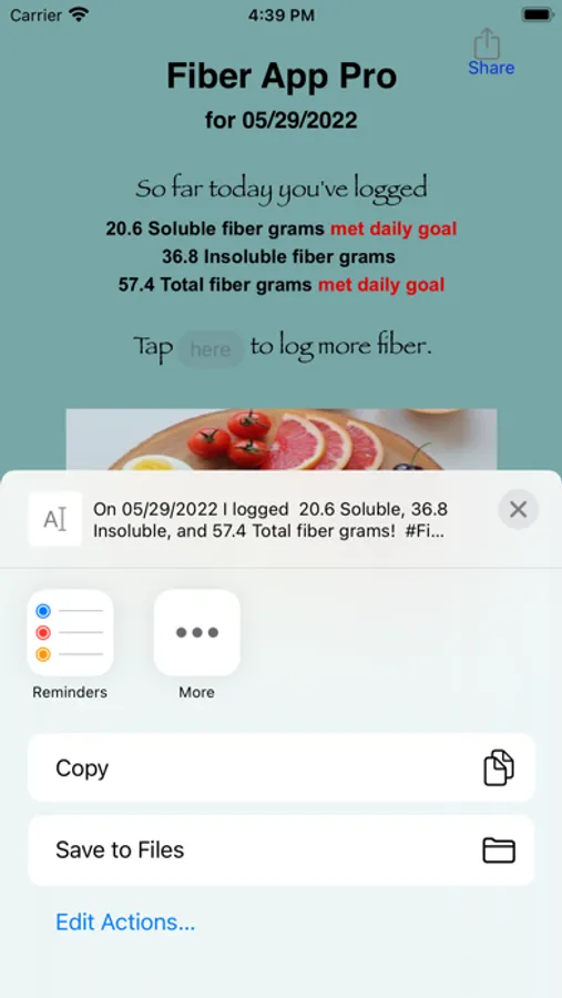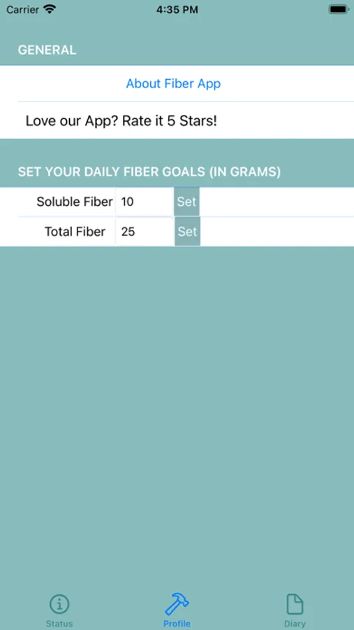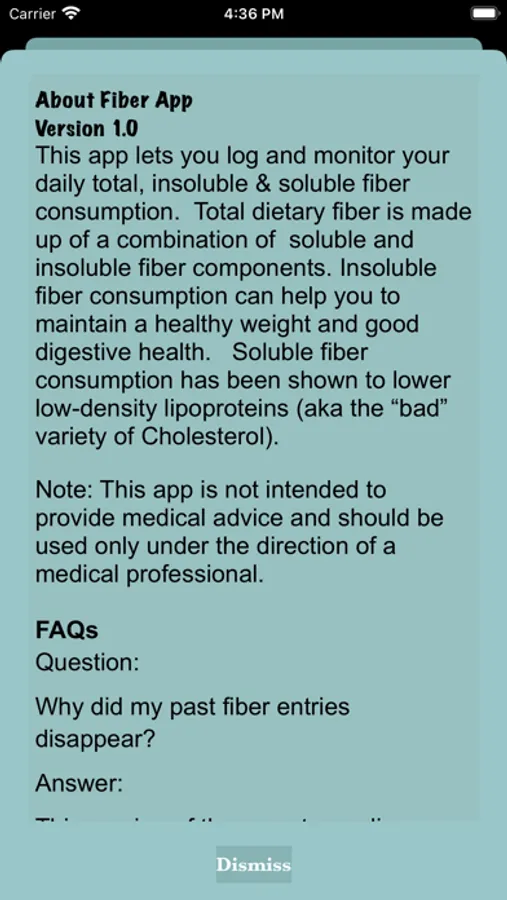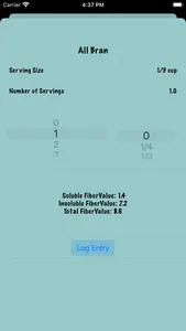 This app lets you log and monitor your daily total, insoluble & soluble fiber consumption. Total dietary fiber is made up of a combination of soluble and insoluble fiber components. Insoluble fiber consumption can help you to maintain a healthy weight and good digestive health. Soluble fiber consumption has been shown to lower low-density lipoproteins (aka the “bad” variety of Cholesterol).