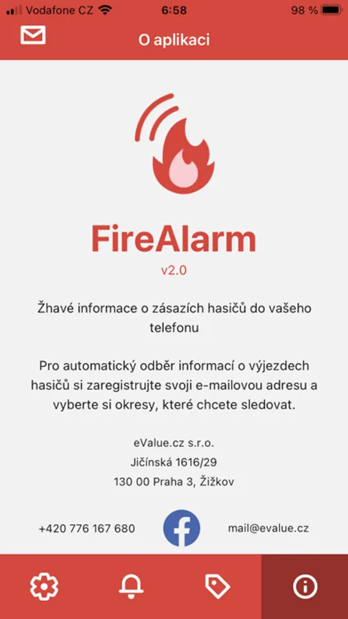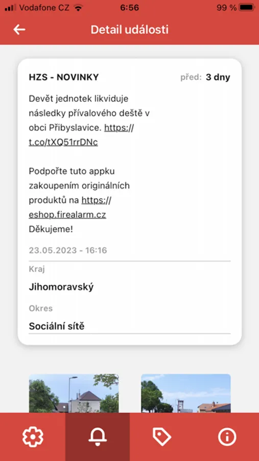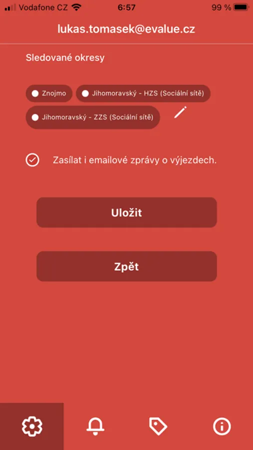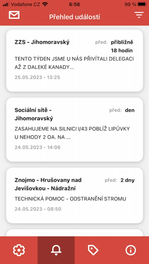 Aplikace pro sledování výjezdů hasičů v šesti krajích ČR (Jihomoravský, Moravskoslezský, Pardubický, Plzeňský, Středočeský, Vysočina) a informací z twitteru a facebooku HZS všech krajů