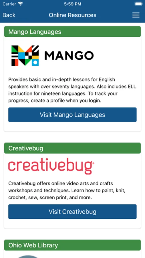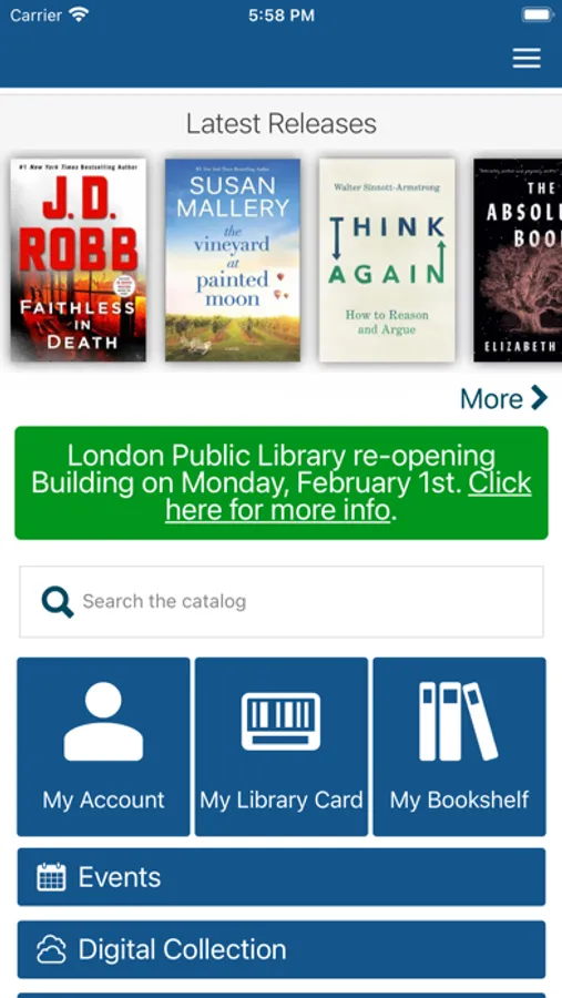 The London Public Library App allows you to search for and request library material and manage your library account.