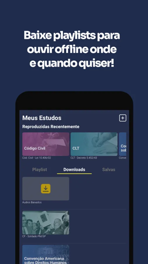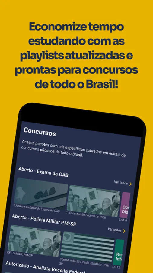 - Leis organizadas por área de estudo e playlists prontas para editais de concursos abertos ou em previsão de abertura.
