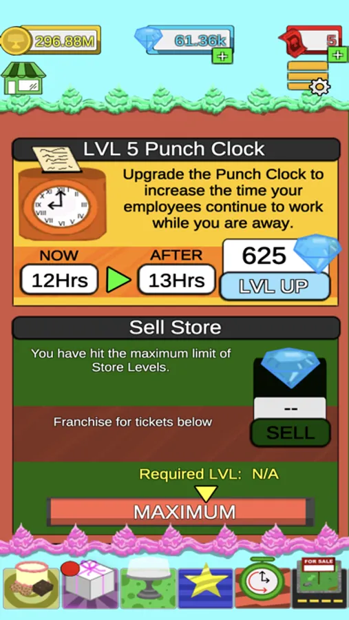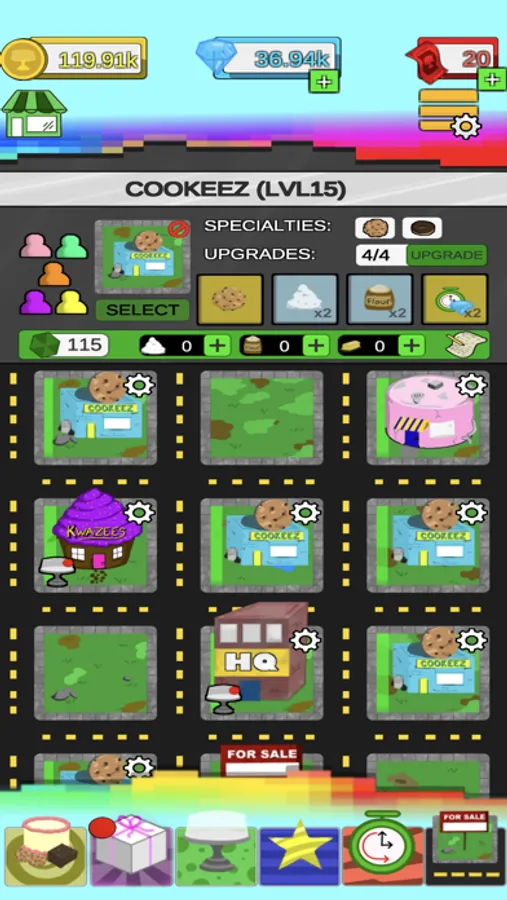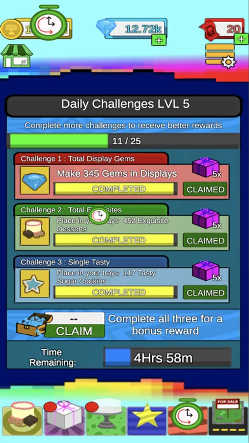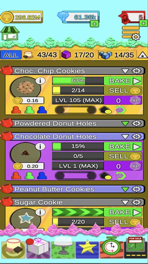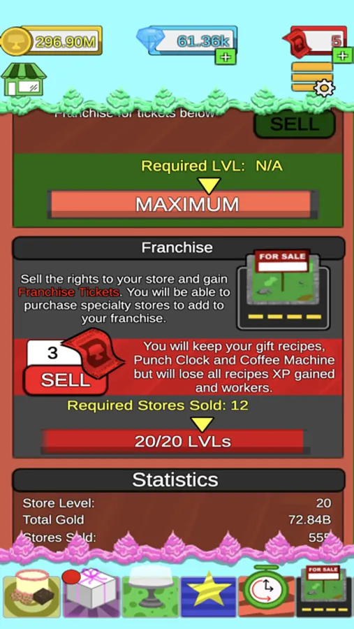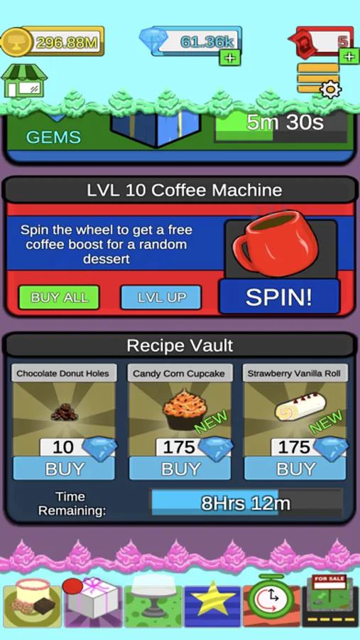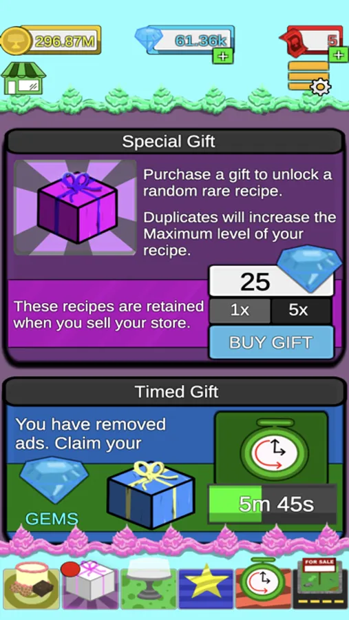Gain coins and sell your store to grow your tycoon empire. Gifts allow you to unlock special rare recipes which you can sell for higher profits. You can bake common, Tasty (uncommon), Yummy (rare), Decadent (epic) and Exquisite (legendary) desserts. Display your baked goods for sale in special display cases to increase your profits.