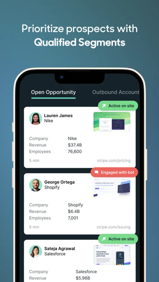 Bring the Qualified command center to your phone. Scroll through prioritized visitor segments and view live streams of website activity to find your most valuable prospects with ease.