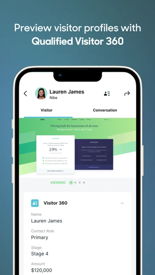 To view a visitor’s profile, simply tap their card and open Visitor 360. Here, you’ll see valuable visitor details like Salesforce CRM, account-based marketing, and firmographic data.