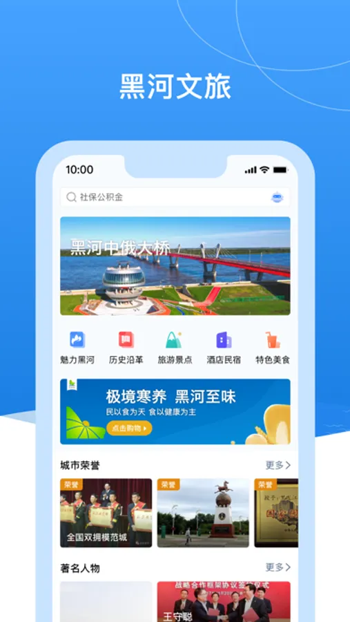 黑河文旅,它作为城市名片,汇集了黑河文化与旅游发展建设成果,为市民提供了解黑河、宣传黑河的平台,有效增强了百姓自豪感。它包括黑河旅游服务、黑河绿色物产服务、城市荣誉和历史人物等内容。