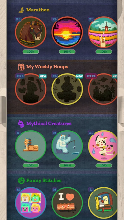 After completion, each Hoop can be alternatively played in Free Stitch mode. Pick your favorite pattern and color it just the way you like!