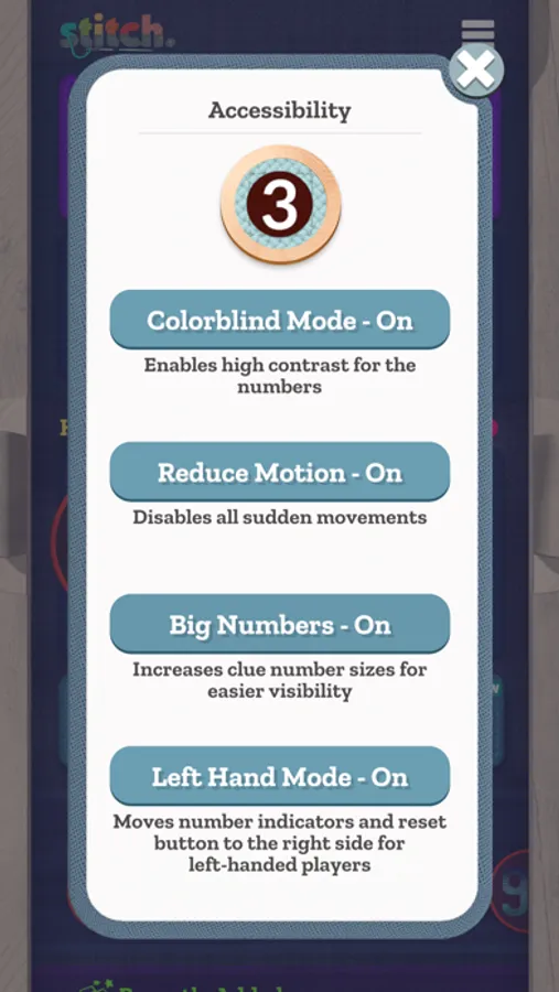 Stitch. offers a range of accessibility features that are imported from your iOS/iPadOS settings and can be managed through the main menu of the game: