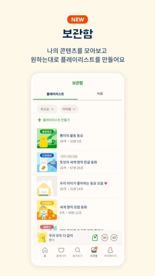 - 우리 아이가 좋아하는 이야기들만 모아 플레이리스트로 만들 수 있어요.