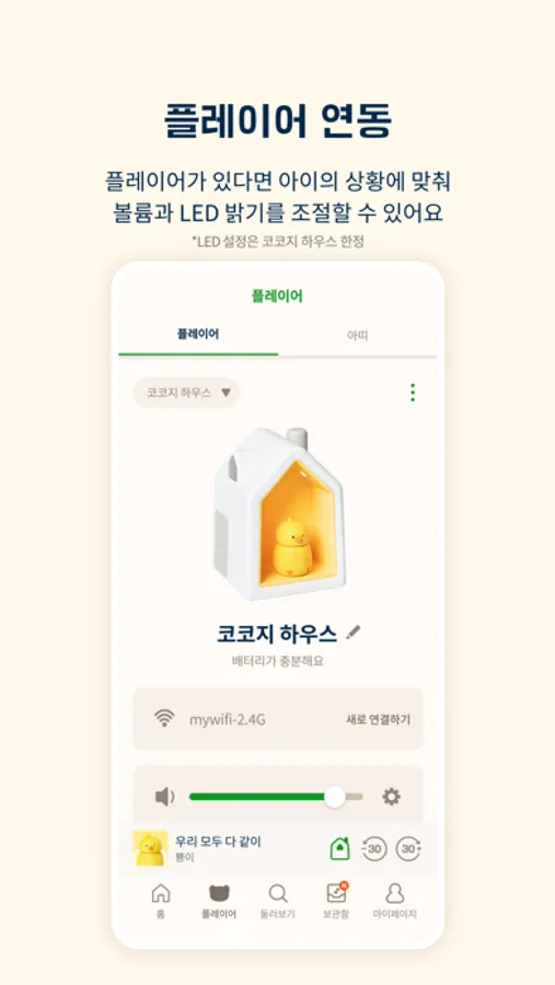 - 코코지 플레이어를 등록하고 음량 조절, LED 밝기 조절 등을 할 수 있어요.