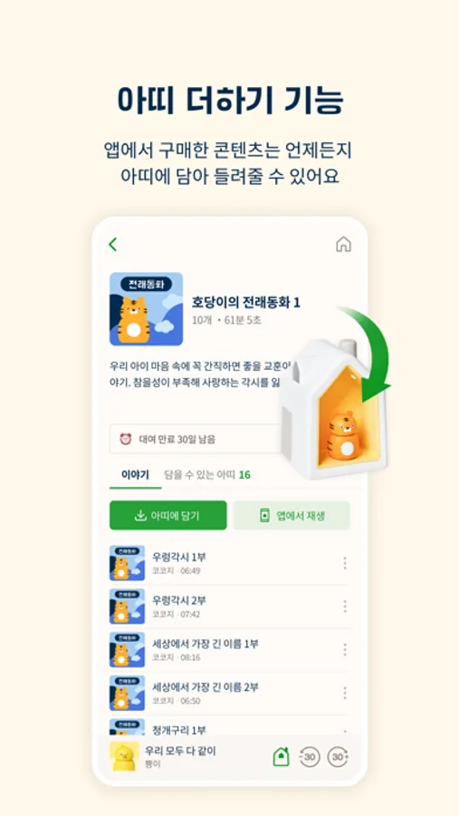 플레이어와 함께 사용하는 아띠에 담긴 콘텐츠는 언제든 앱에서 새롭게 교체할 수 있어, 아이가 태어나서부터 초등 교육을 받을 때까지 단계별로 필요한 이야기를 계속 들려줄 수 있어요.