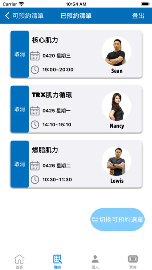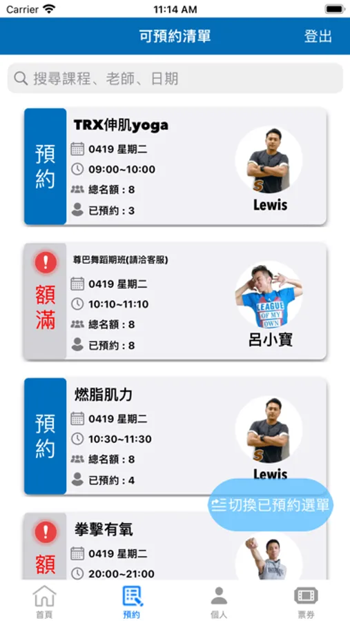 1.預約課程(搜尋課程、查詢已預約清單、學員名單、預約課前提醒)