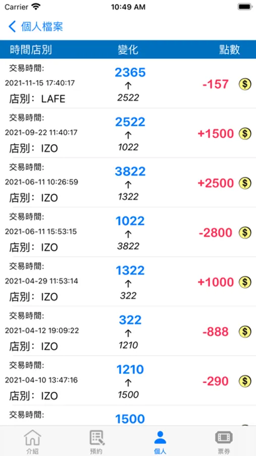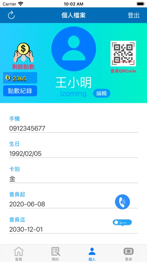 3.個人檔案(查詢點數餘額及交易明細、姓名、暱稱、手機、生日、卡別、會員起迄、意見反饋、客服電話)