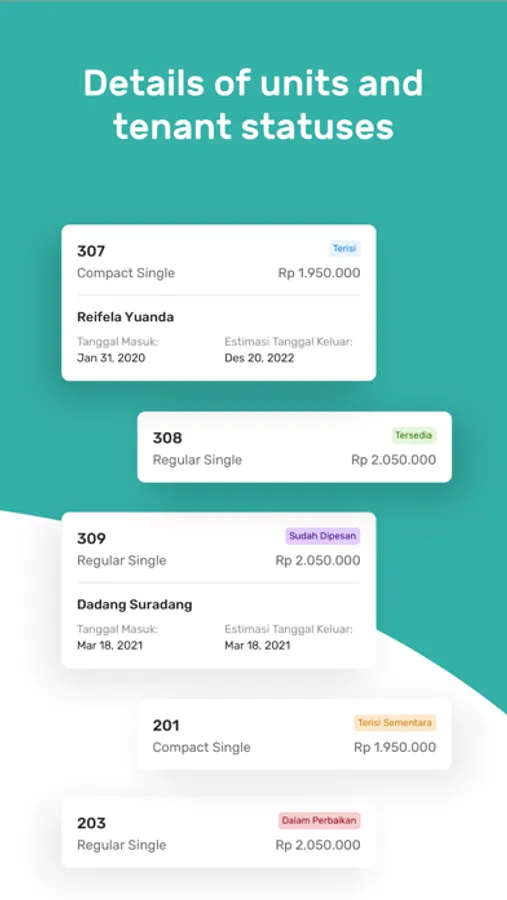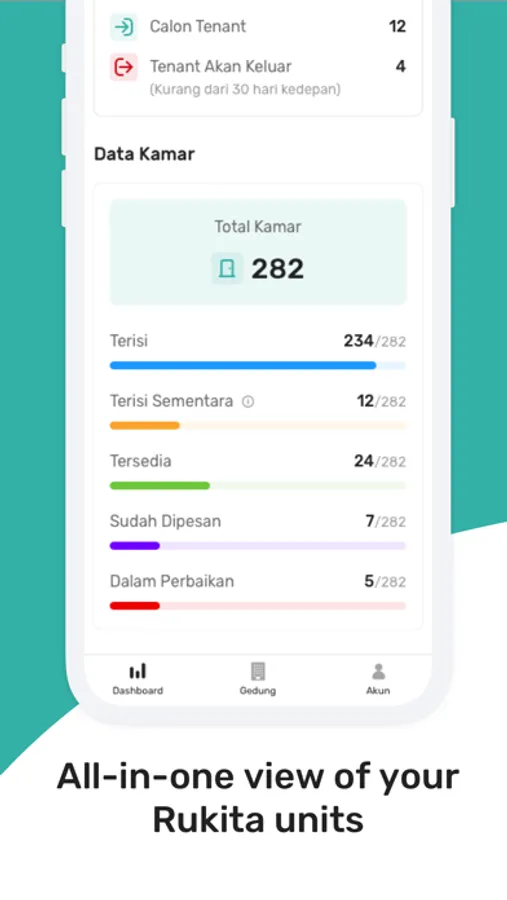 Let us tell you a few amazing things you can accomplish with this app; a bird's eye view and the latest updates of your Rukita properties, monthly reports, and you're also able to check out specific updates of room and tenant's details - this includes insights for potential new tenants, too!