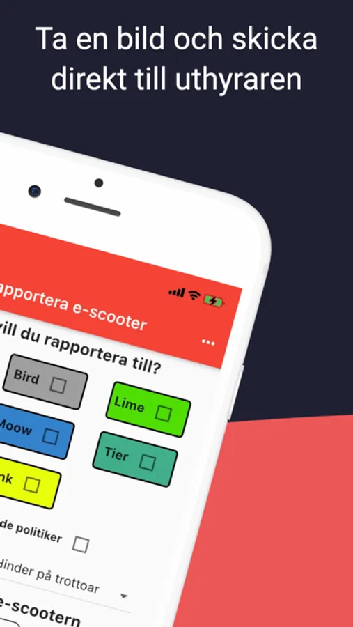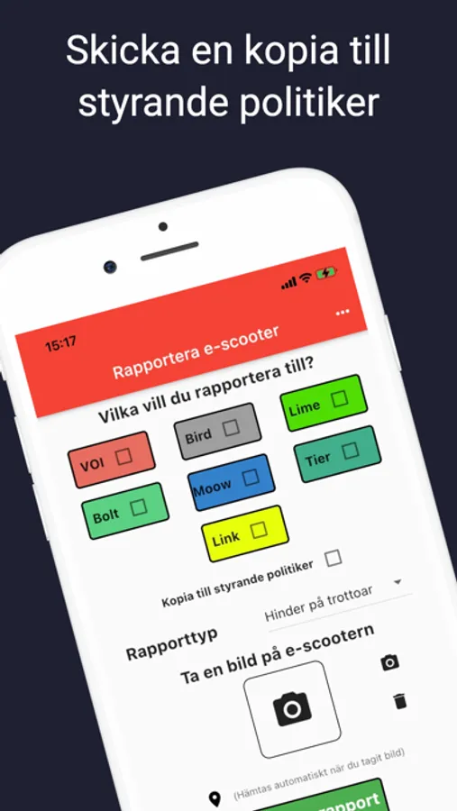 Rapportera enkelt e-scooters som hindrar framkomlighet eller skräpar ner. Ta en bild direkt i appen så skapas ett e-postmeddelande med all information åt dig.