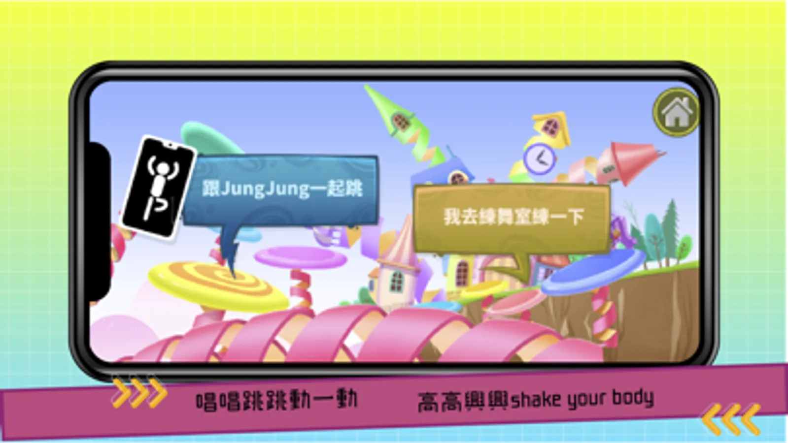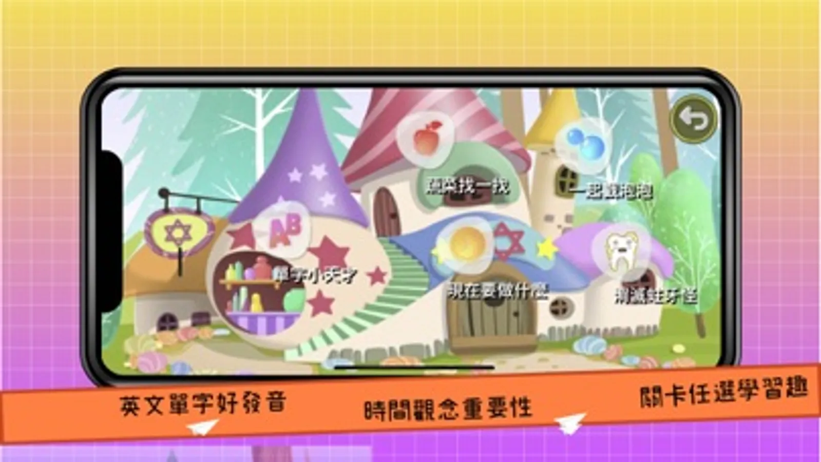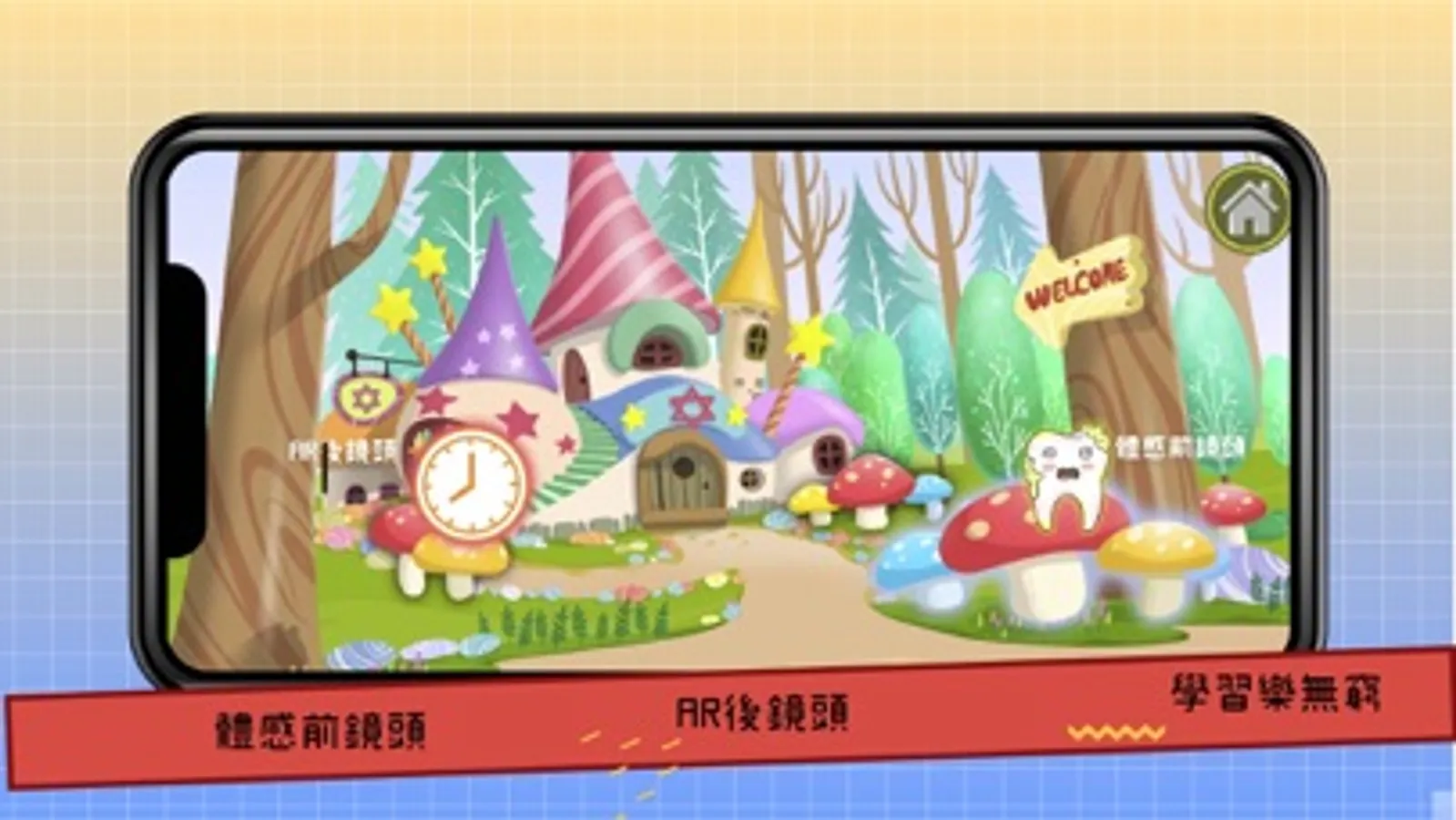 v 體感功能透過前鏡頭,小朋友可經由不同關卡,與關卡內的道具一起互動,學習活潑又有趣