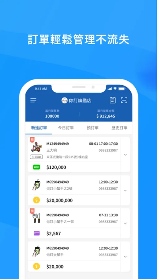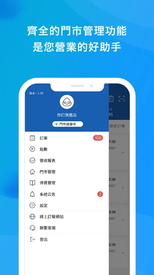 2.訂單管理 : 訂單狀態管理以及外送管理,您可收到新訂單推播通知。