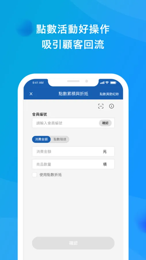 4.點數管理 : 掃描會員條碼功能,讓顧客於門市線下消費時,也可以累積點數、折抵消費,並能查看點數異動紀錄。