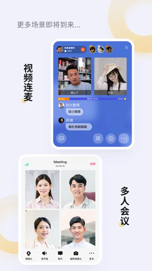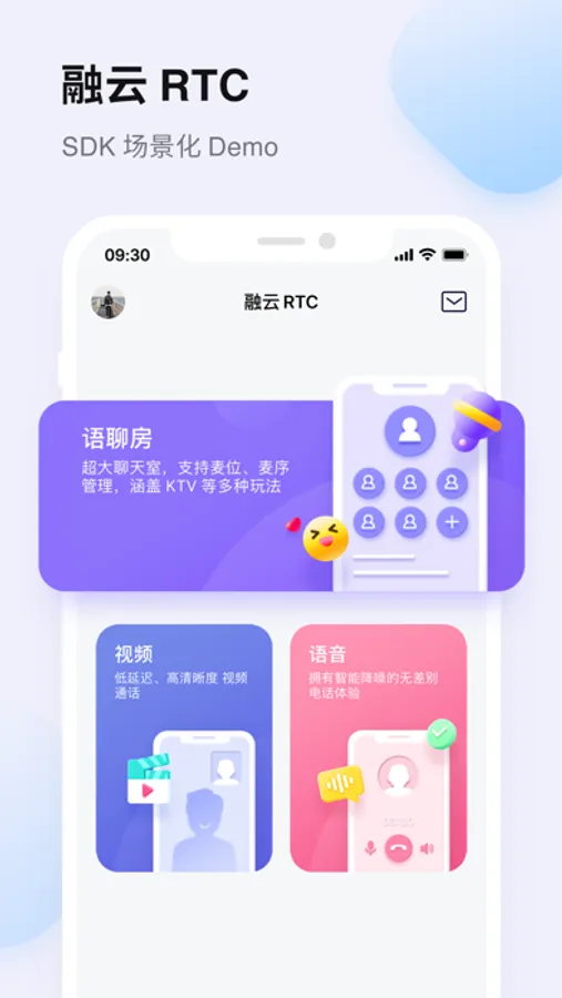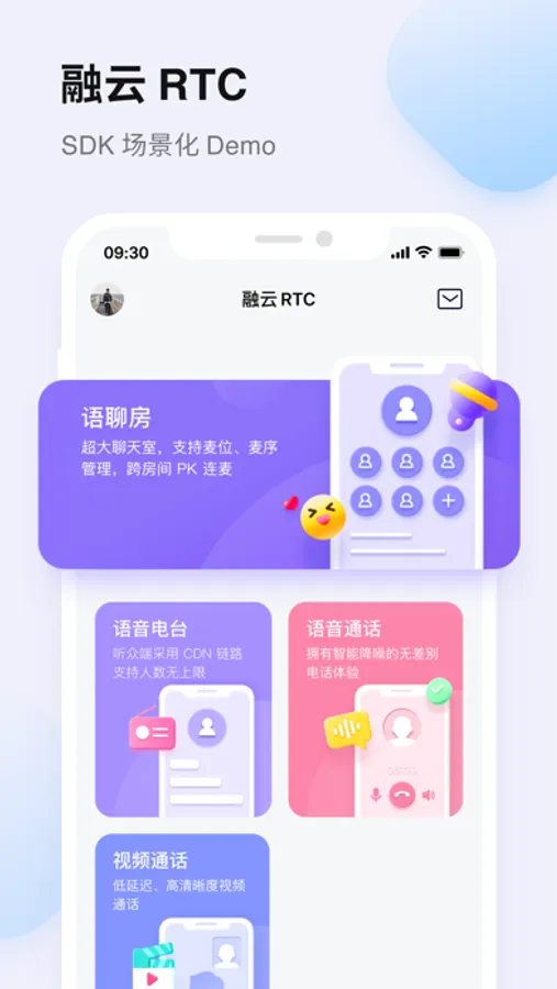 本应用的演示场景包含语聊房、语音电台、视频呼叫、语音呼叫等,视频直播、KTV交友、视频会议等更多场景正在开发中。