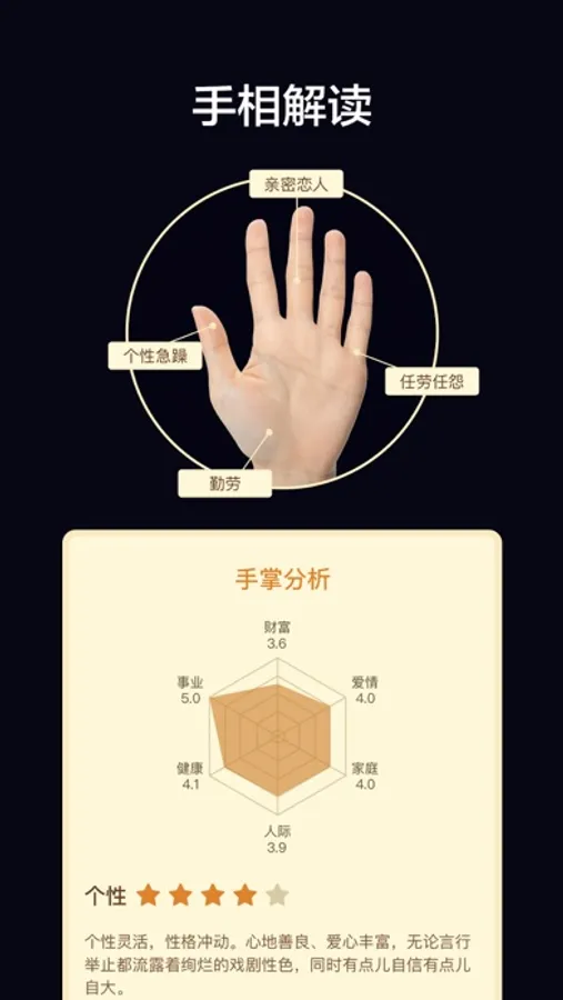 Palmistry originated in China. Everyone’s palm prints are unique. The palm prints are obtained by taking photos. According to the shape, color, texture and other characteristics of the palm, the five palm prints of life, feelings, wisdom, career and marriage can be identified. The line uses artificial intelligence analysis to provide detailed reports to make palmistry analysis interesting and fun, combined with psychological tests to help you see the real you and gain a deeper understanding of your inner self.