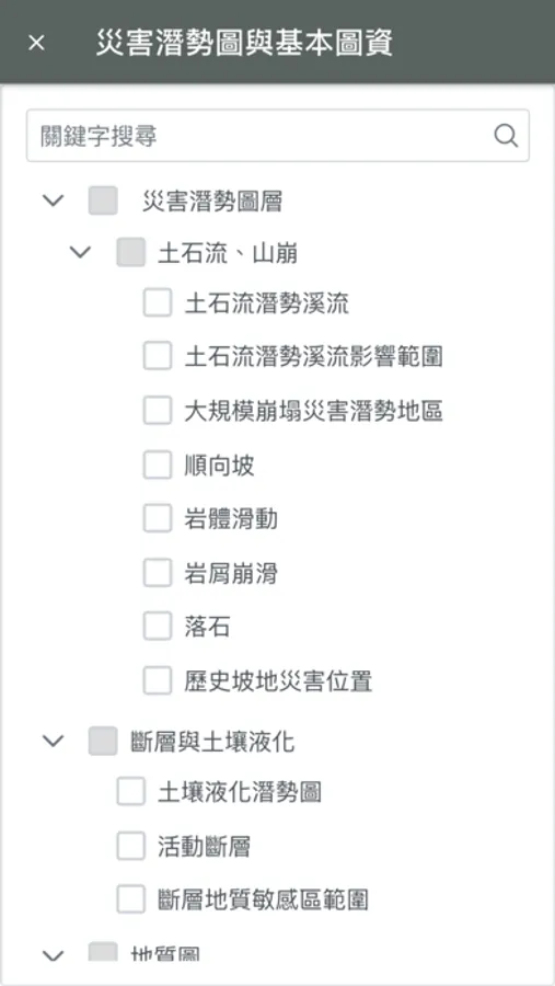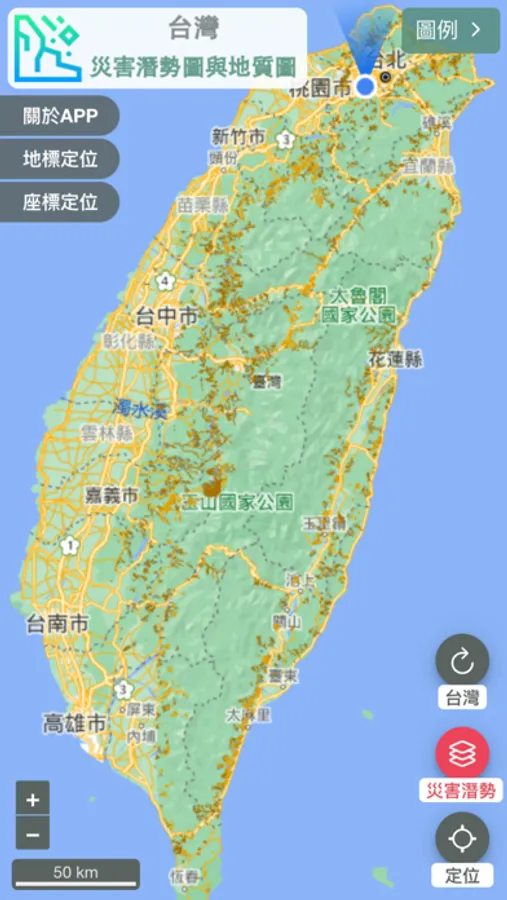 台灣災害警示資料呈現,提供相關圖層進行套疊。另提供座標與地標定位,方便進行交叉比對。