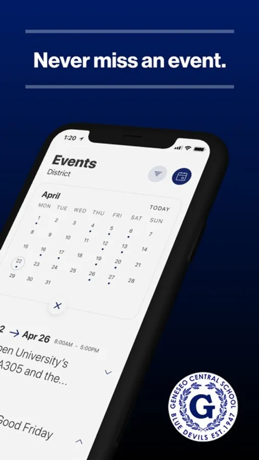 The event section shows a list of events throughout the district. Users can add an event to your calendar to share the event with friends and family with one tap.
