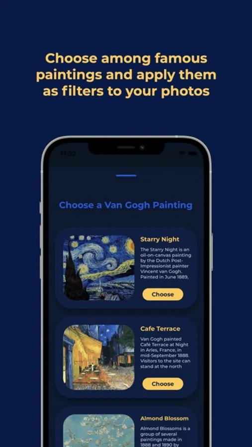 Van Gogh Filter Cam is an app that uses Artificial Intelligence to convert your photos into famous Vincent van Gogh style paintings. It contains four Van Gogh Style Paintings: