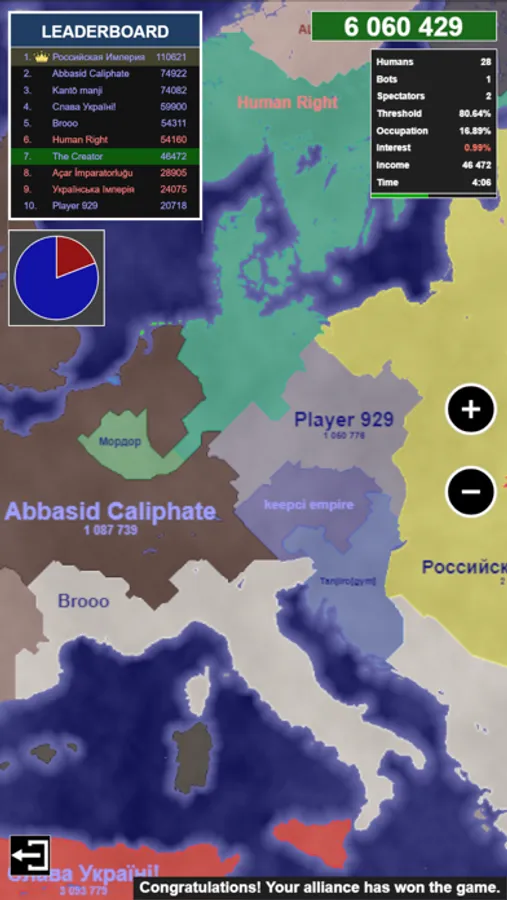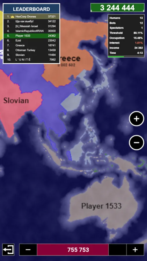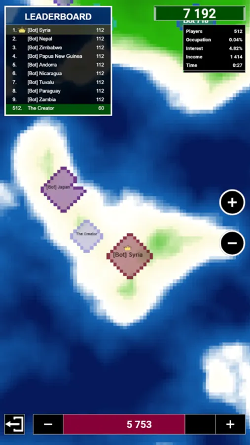 Play against bots and other people online! Conquer territory and defeat other nations. Play with more than 500 players at the same time. Find a good strategy and become number 1 on the leaderboard.