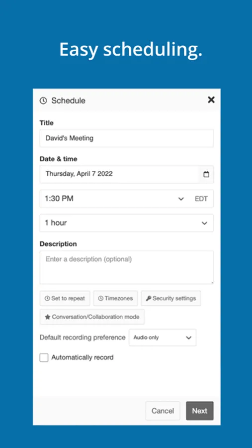 ● Schedule calls on the go or start a call on-the-fly with the click of a button