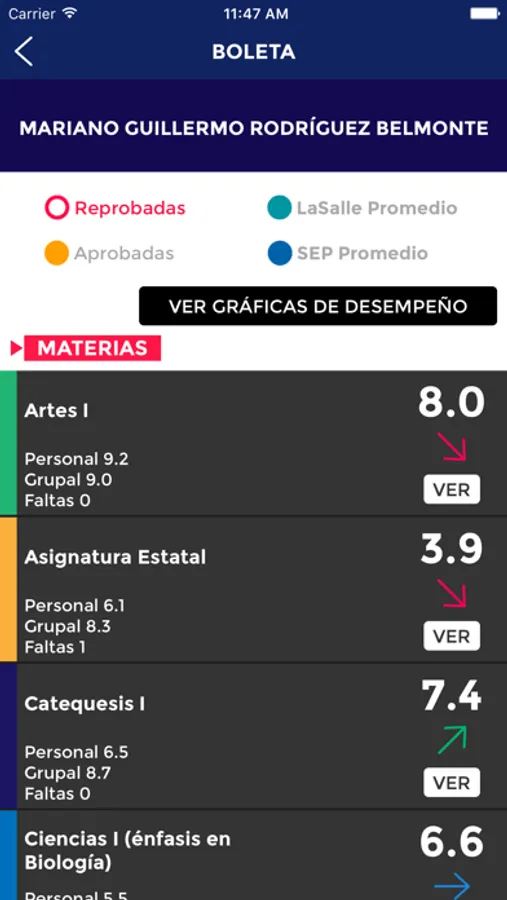 - Consulta el histórico de calificaciones, gráficas de desempeño, faltas y retardos de cada periodo