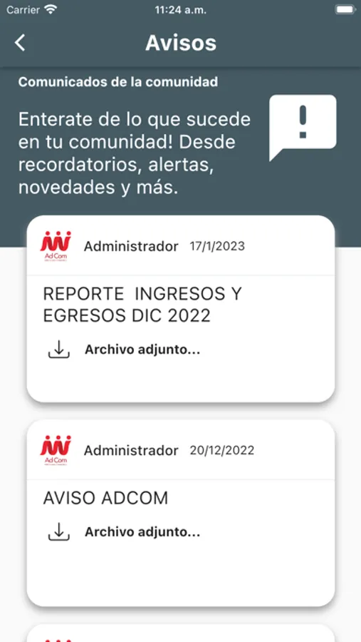 Entérate de tus cuotas, aparta tus servicios de comunidad y si ves algo inusual reporta a través de la app. AdCom, administrando tu comunidad