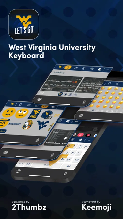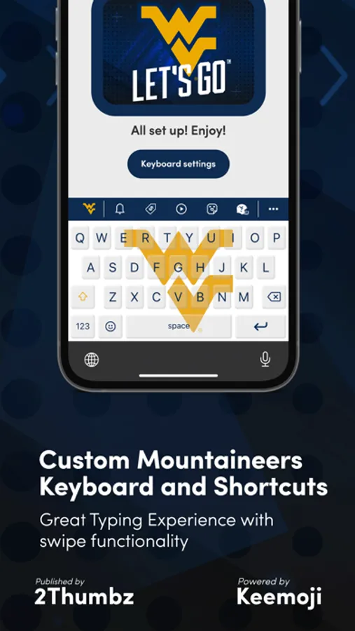 West Virginia University Keyboard is the officially licensed fan app for enjoying the full Mountaineer experience. This app is owned and published by 2Thumbz, a leading mobile app development company and a trusted collegiate publisher since 2003.