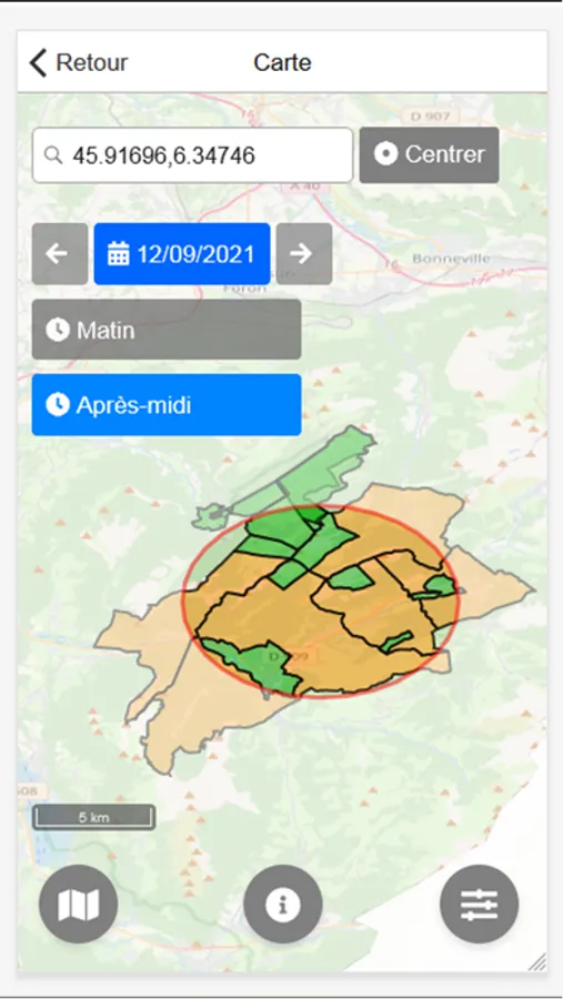 Le territoire affiché peut comprendre les zones situées dans un rayon de 5, 10 ou 15km autour de la position choisie.