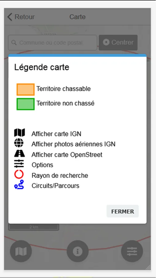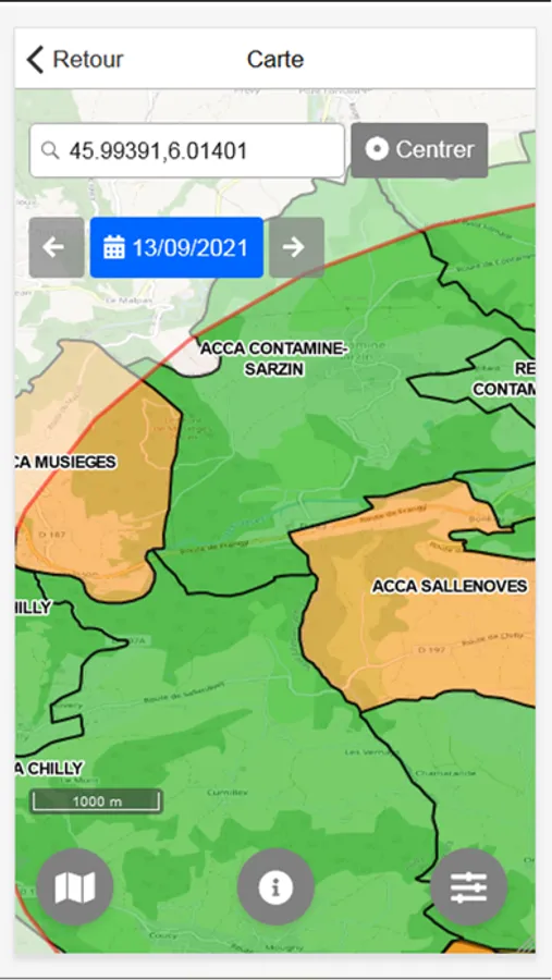En indiquant la date et la position qui vous intéressent (commune ou position GPS), vous obtiendrez une carte des territoires chassables et non chassés.