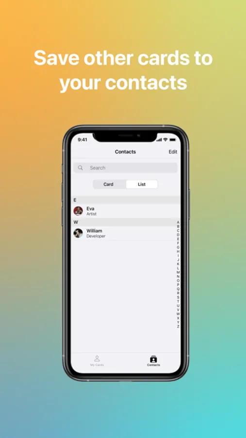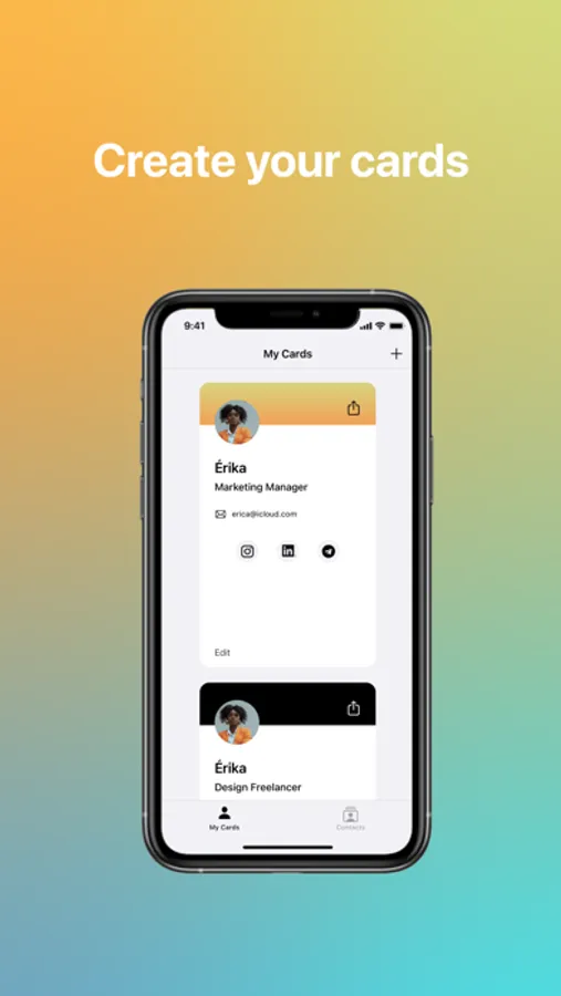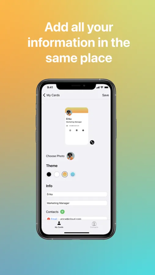With Connect Card you can keep your key contact information together and share it easily. You can also save other people's cards for easy access.