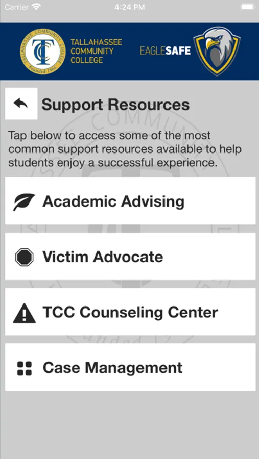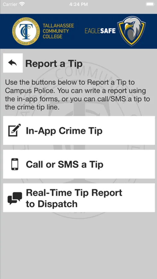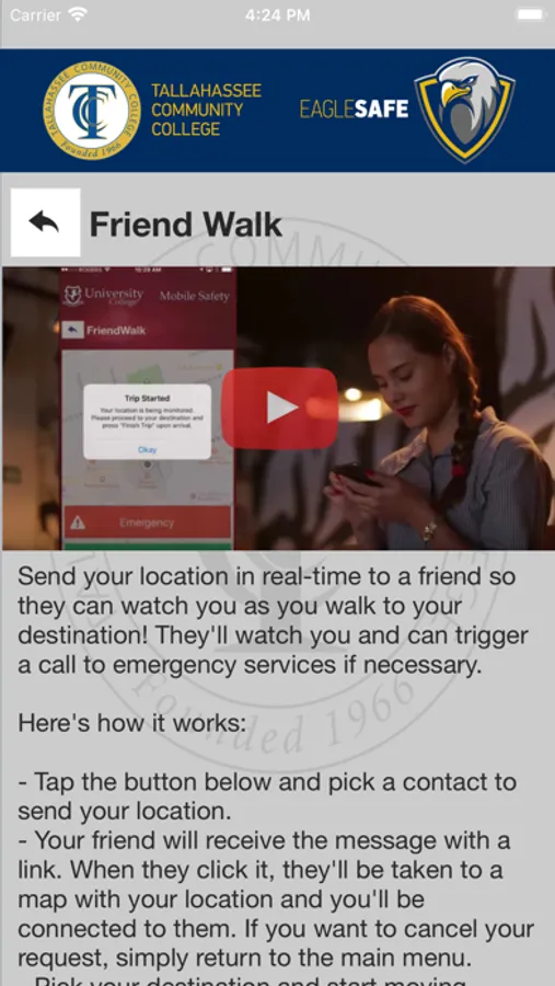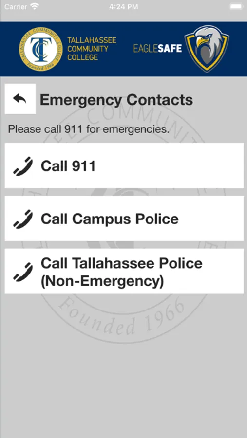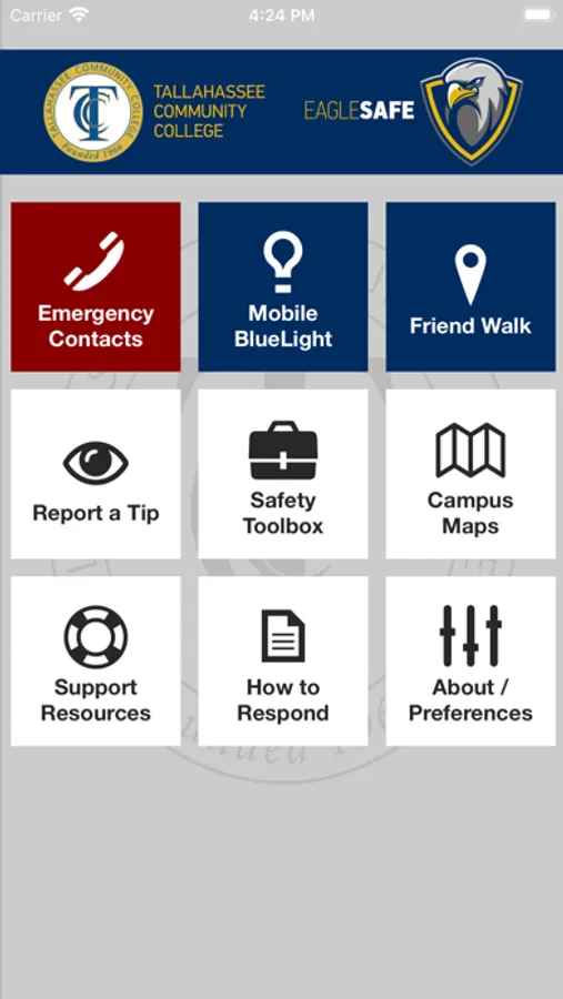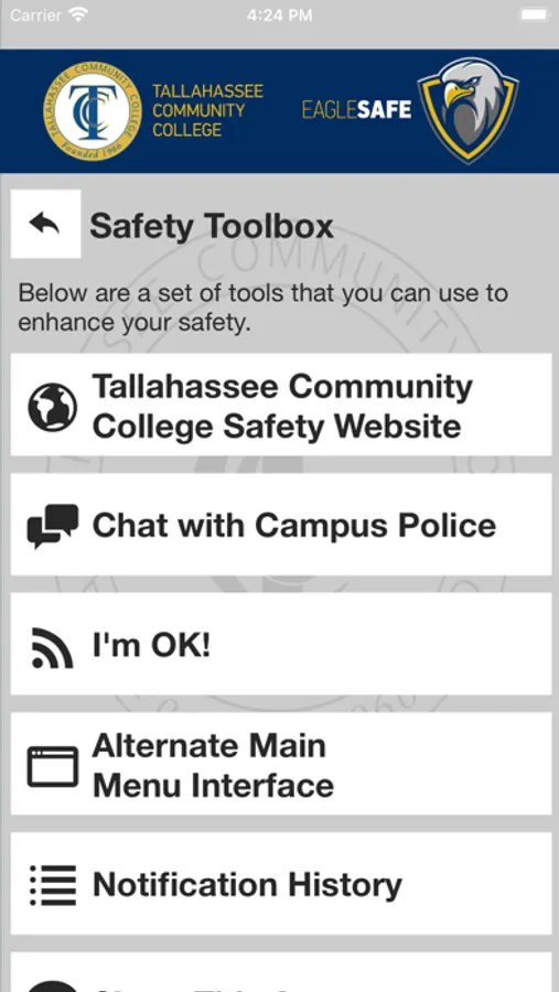 Eagle Safe is the official safety app of Tallahassee Community College. It is the only app that integrates with Tallahassee Community College's safety and security systems. Campus Safety has worked to develop a unique app that provides students, faculty and staff with added safety on the Tallahassee Community College campus. The app will send you important safety alerts and provide instant access to campus safety resources.