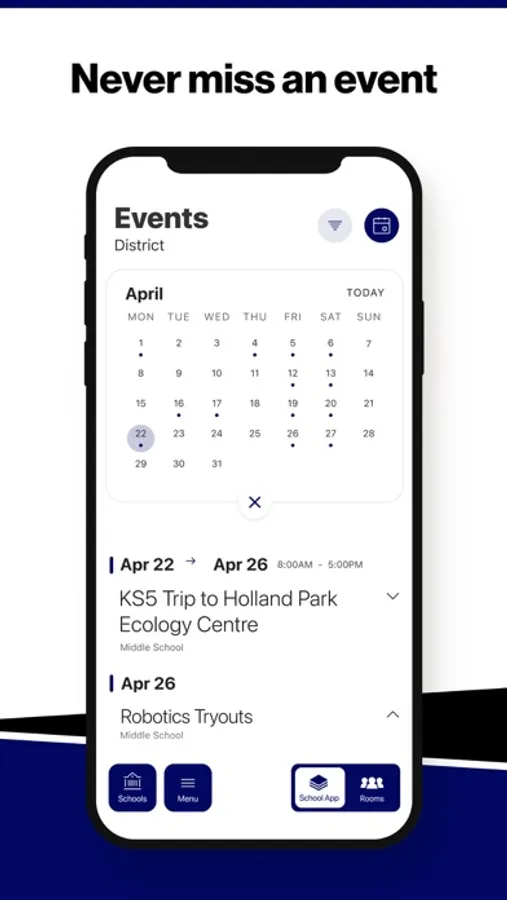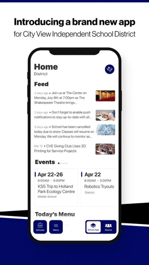 The event section shows a list of events throughout the district. Users can add an event to your calendar to share the event with friends and family with one tap.