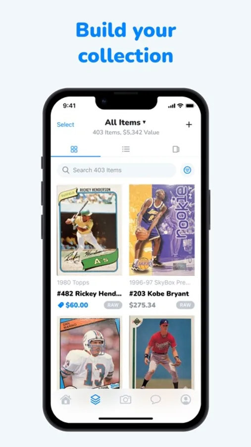 Create and keep track of your card values. View your collection as a grid, list, or as sets. You can also filter and sort your cards by a variety of criteria — value, date added, year, team, etc. With CollX Pro, you can export your collection as a CSV. You can also view your sets, see how close you are to completion, and generate printable checklists to help track down cards you're missing from a set.
