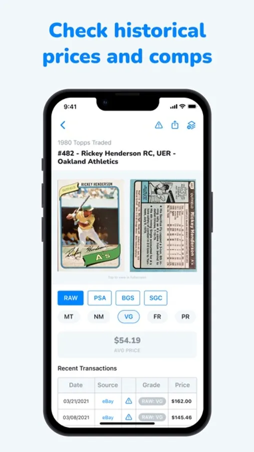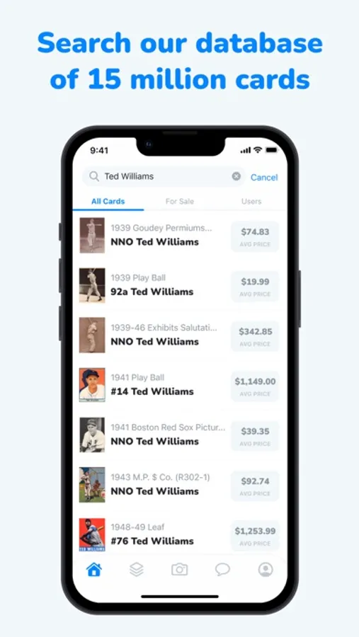 Search 17+ million cards in our database. See what cards on CollX are listed for sale right in search results. And if you find a card you own, but don’t have it handy to scan, you can easily add it from any of the records in the CollX database.